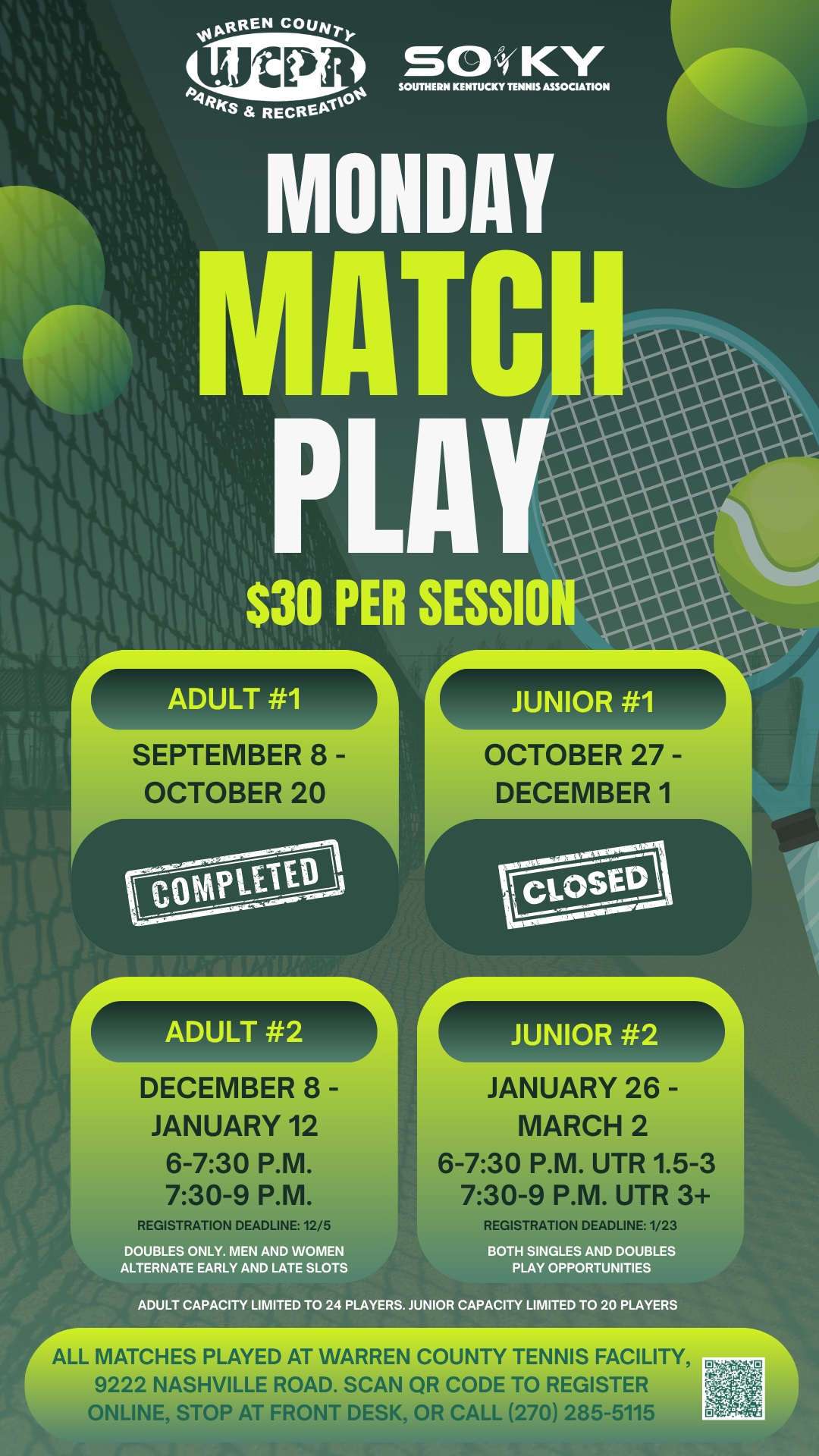 Monday Night Match Play is back for a second year! This fall, we're adding two junior match play sessions. We are halfway through the season with this program. Sign up to claim your spot. Hope to see you there!
