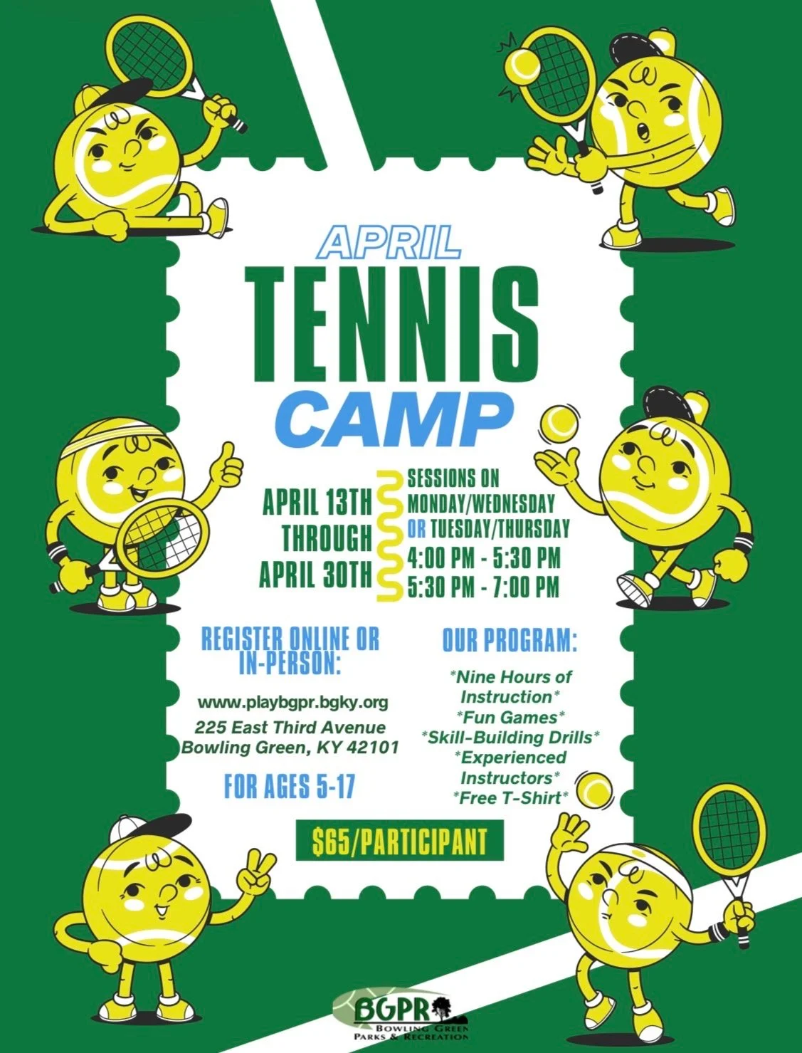 Tennis Camp with Bowling Green Parks & Recreation starts April 13th! This is a great way to get your beginning to intermediate level tennis player involved in the sport. Find out all the information you need right here: https://playbgpr.bgky.org/webtrac/web/splash.html